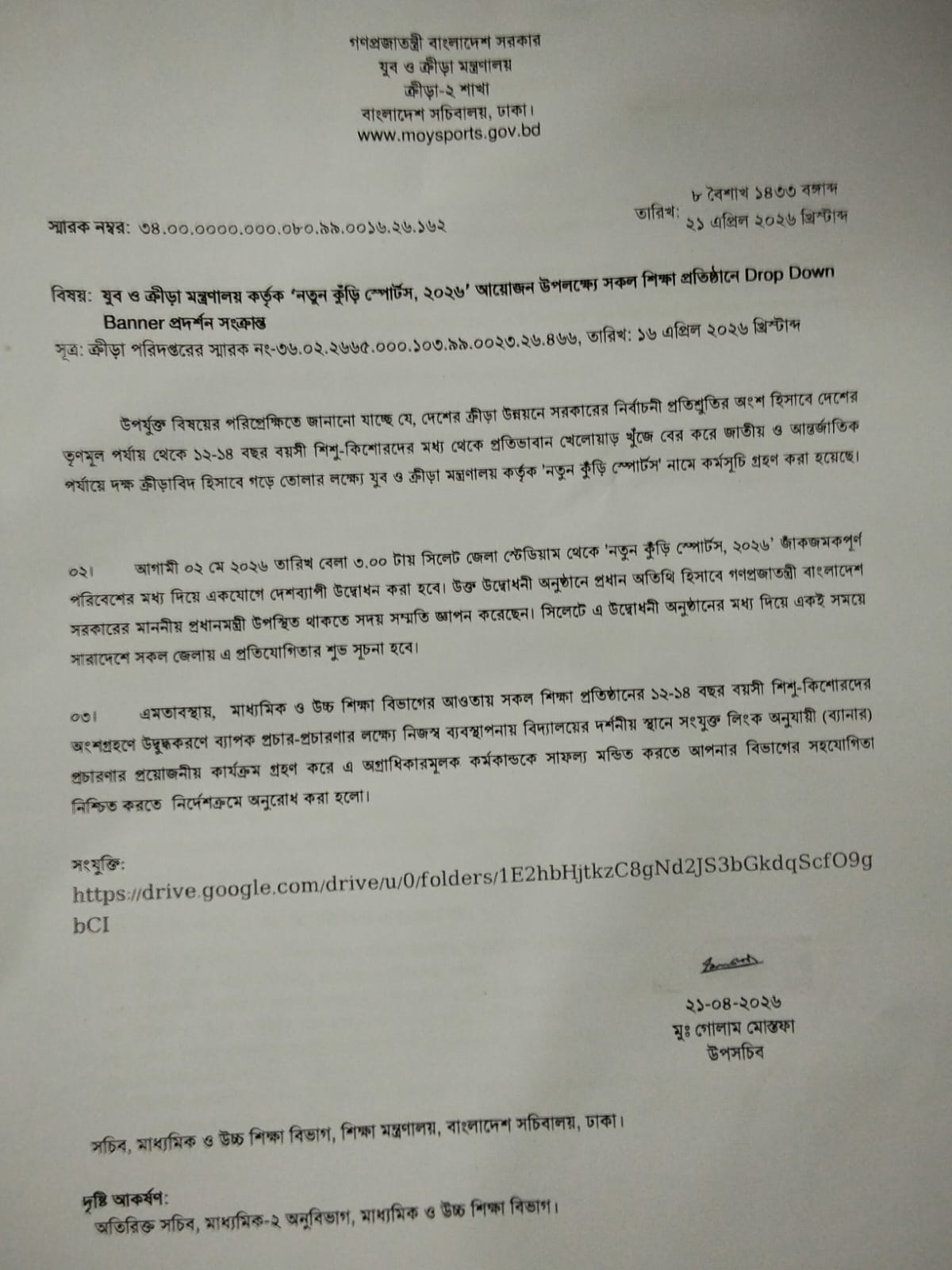 যুব ও ক্রীড়া মন্ত্রণালয় কর্তৃক নতুন কুড়ি স্পোর্টস, ২০২৬ আয়োজনে রেজিস্ট্রেশন প্রসঙ্গে ।